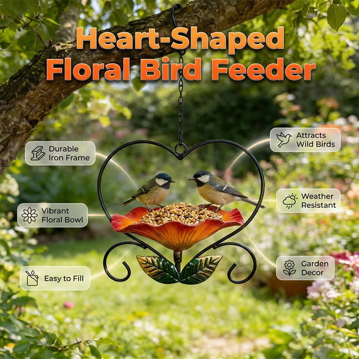 HEART-SHAPED FLORAL BIRD FEEDERย - Transform your outdoor space with this beautiful heart-shaped floral bird feeder. Its vibrant design attracts various wild birds, adding life and color to your garden.